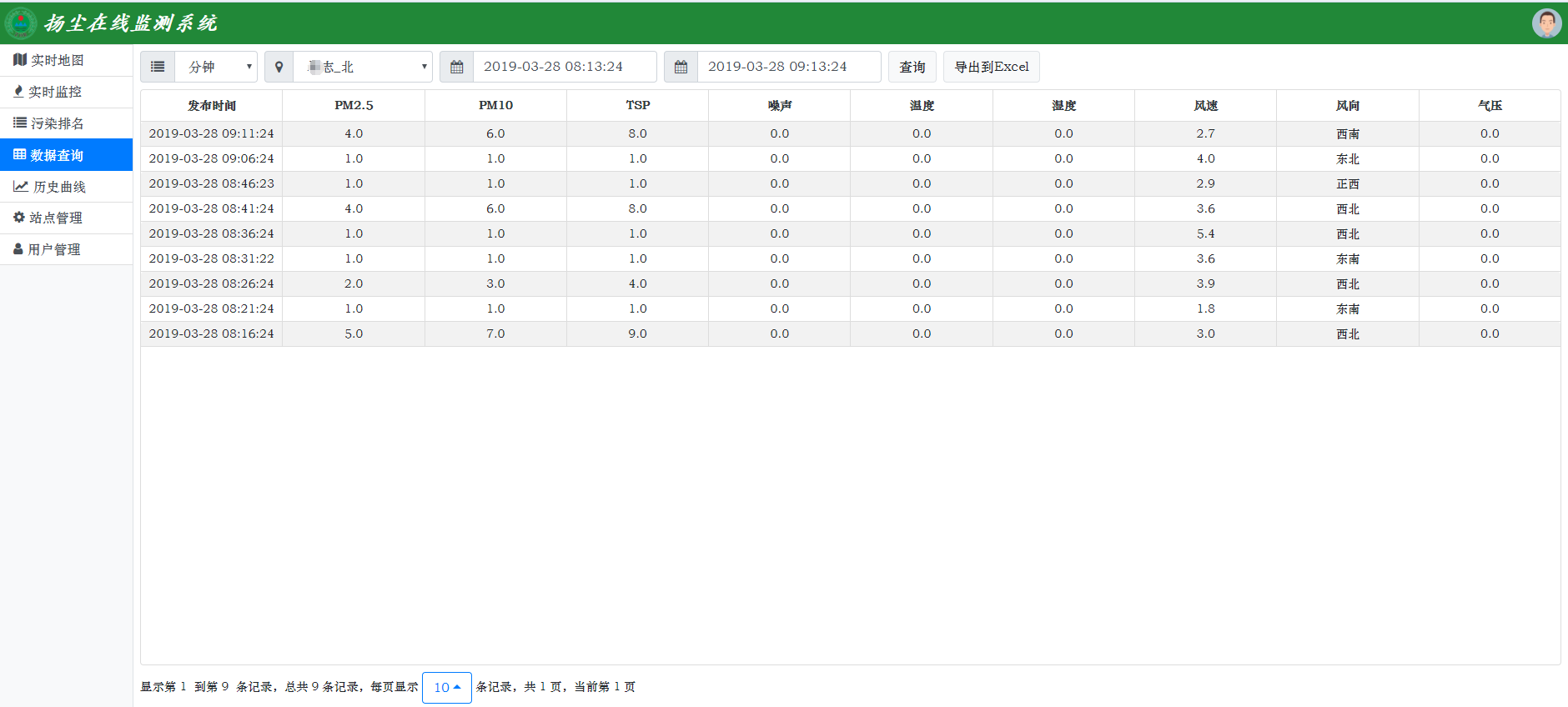 歷史數(shù)據(jù)查詢:系統(tǒng)提供歷史數(shù)據(jù)查詢功能,用戶通過設(shè)置時間類型、站點、查詢時間選項后,即可查看到所選擇站點的歷史數(shù)據(jù)信息,包括各項監(jiān)測因子、數(shù)據(jù)更新時間等,查詢結(jié)果支持選用EXCEL文檔形式導(dǎo)出。