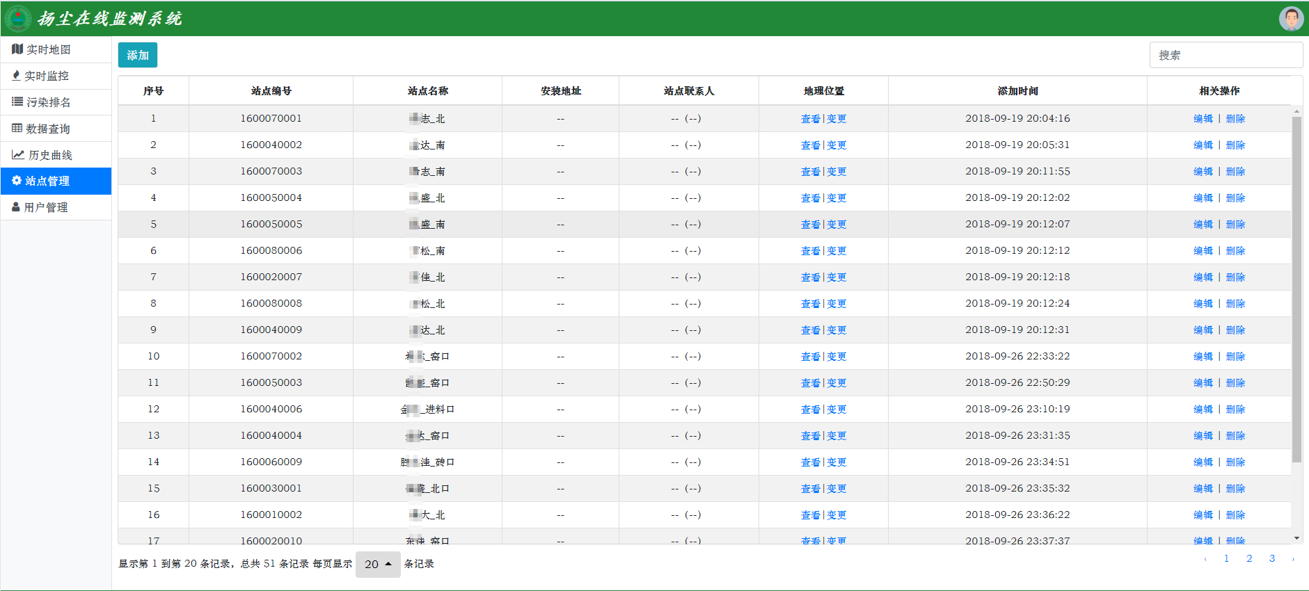 站點管理:用戶在此模塊可以實現(xiàn)監(jiān)測點位信息的增、改、查、刪等基本操作,點位信息包括監(jiān)測點位名稱、地址、經(jīng)緯度、站點ID、所在區(qū)域名稱等內(nèi)容,實現(xiàn)點位信息的動態(tài)管理,區(qū)域與編號為鎖定狀態(tài),可自行配置名稱、經(jīng)緯度、排名、公開、掉線預(yù)警等選項。